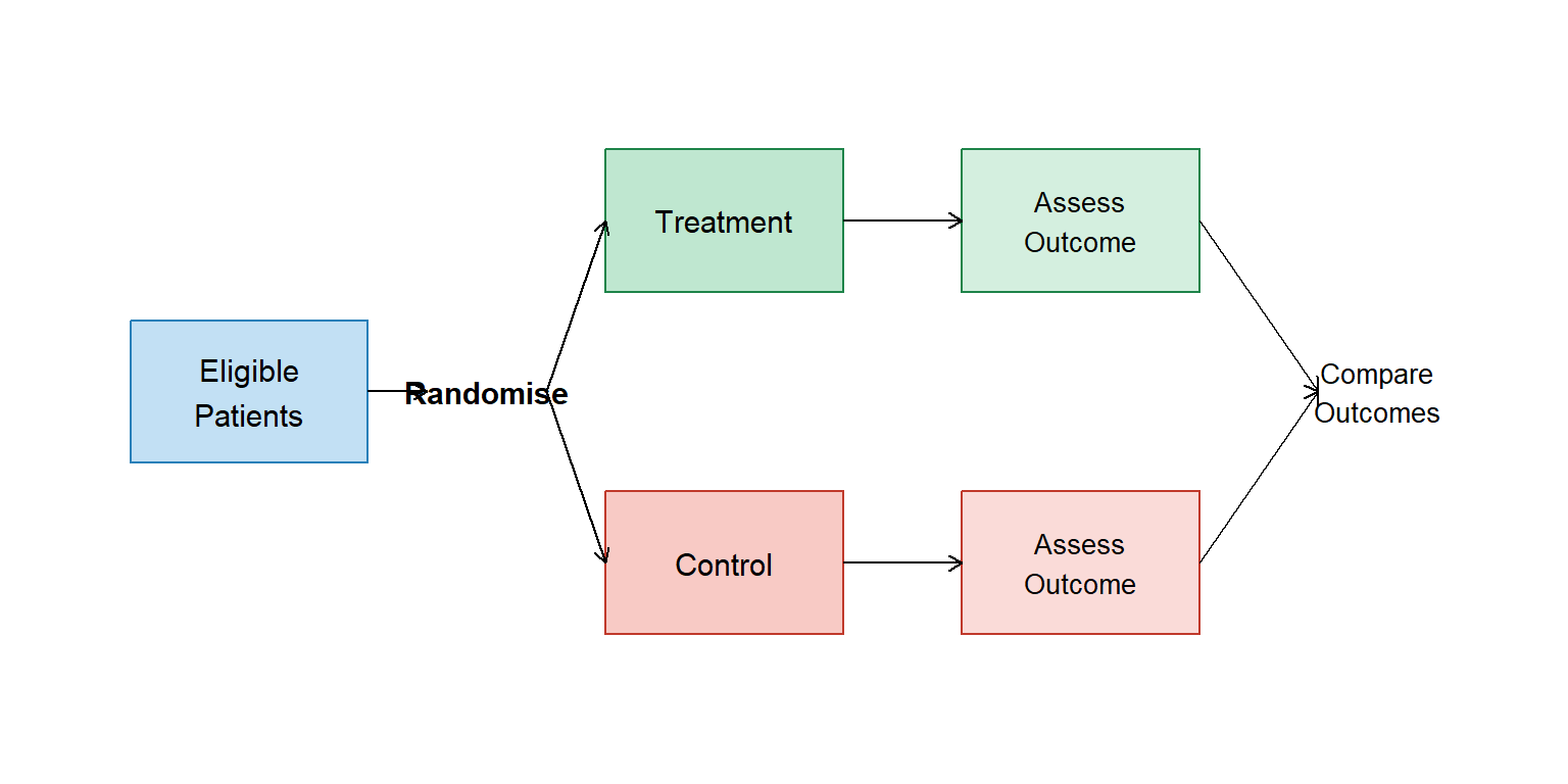 # Simple diagramggplot() +# Population boxannotate("rect", xmin =0, xmax =2, ymin =2, ymax =3, fill ="#3498db", alpha =0.3, colour ="#2980b9") +annotate("text", x =1, y =2.5, label ="Eligible\nPatients", size =4) +# Randomisationannotate("text", x =3, y =2.5, label ="Randomise", size =4, fontface ="bold") +# Treatment armannotate("rect", xmin =4, xmax =6, ymin =3.2, ymax =4.2, fill ="#27ae60", alpha =0.3, colour ="#1e8449") +annotate("text", x =5, y =3.7, label ="Treatment", size =4) +# Control armannotate("rect", xmin =4, xmax =6, ymin =0.8, ymax =1.8, fill ="#e74c3c", alpha =0.3, colour ="#c0392b") +annotate("text", x =5, y =1.3, label ="Control", size =4) +# Outcome boxesannotate("rect", xmin =7, xmax =9, ymin =3.2, ymax =4.2, fill ="#27ae60", alpha =0.2, colour ="#1e8449") +annotate("text", x =8, y =3.7, label ="Assess\nOutcome", size =3.5) +annotate("rect", xmin =7, xmax =9, ymin =0.8, ymax =1.8, fill ="#e74c3c", alpha =0.2, colour ="#c0392b") +annotate("text", x =8, y =1.3, label ="Assess\nOutcome", size =3.5) +# Arrowsannotate("segment", x =2, xend =2.5, y =2.5, yend =2.5,arrow =arrow(length =unit(0.2, "cm"))) +annotate("segment", x =3.5, xend =4, y =2.5, yend =3.7,arrow =arrow(length =unit(0.2, "cm"))) +annotate("segment", x =3.5, xend =4, y =2.5, yend =1.3,arrow =arrow(length =unit(0.2, "cm"))) +annotate("segment", x =6, xend =7, y =3.7, yend =3.7,arrow =arrow(length =unit(0.2, "cm"))) +annotate("segment", x =6, xend =7, y =1.3, yend =1.3,arrow =arrow(length =unit(0.2, "cm"))) +# Compareannotate("segment", x =9, xend =10, y =3.7, yend =2.5,arrow =arrow(length =unit(0.2, "cm"))) +annotate("segment", x =9, xend =10, y =1.3, yend =2.5,arrow =arrow(length =unit(0.2, "cm"))) +annotate("text", x =10.5, y =2.5, label ="Compare\nOutcomes", size =3.5) +theme_void() +coord_cartesian(xlim =c(-0.5, 11.5), ylim =c(0, 5))